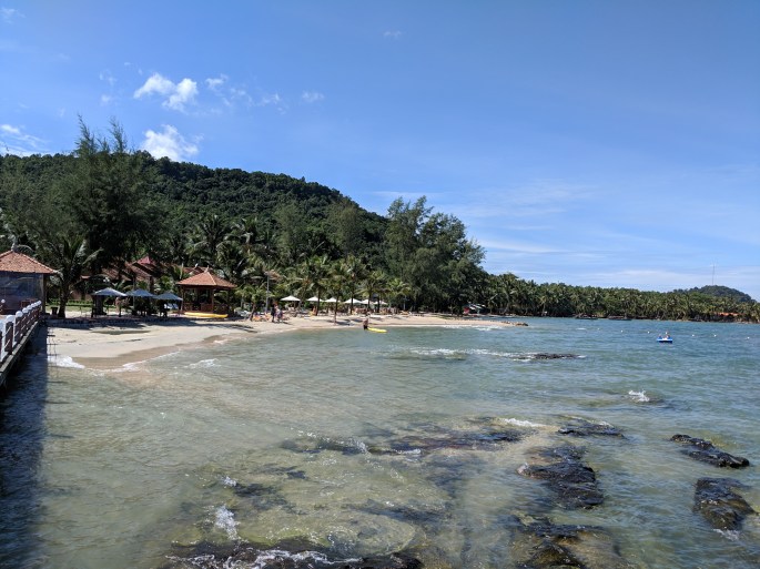 Opted for a beach on the northwest part of the island at a resort called Gold Coast. We are truly fortunate, the beach is beautiful with white sand and a gentle surf and lined with coconut palms. The mountains of Cambodia can be seen to the northwest.