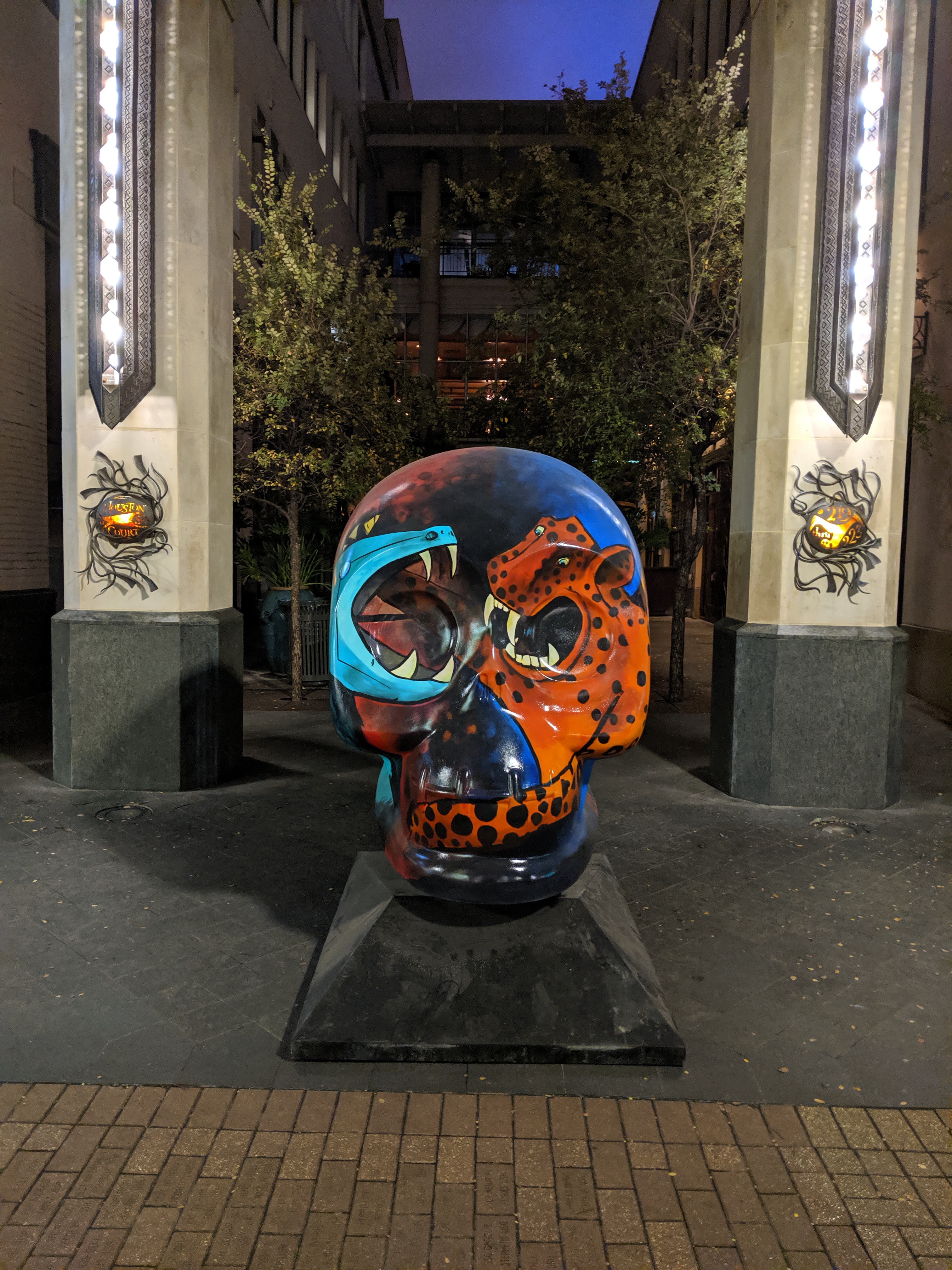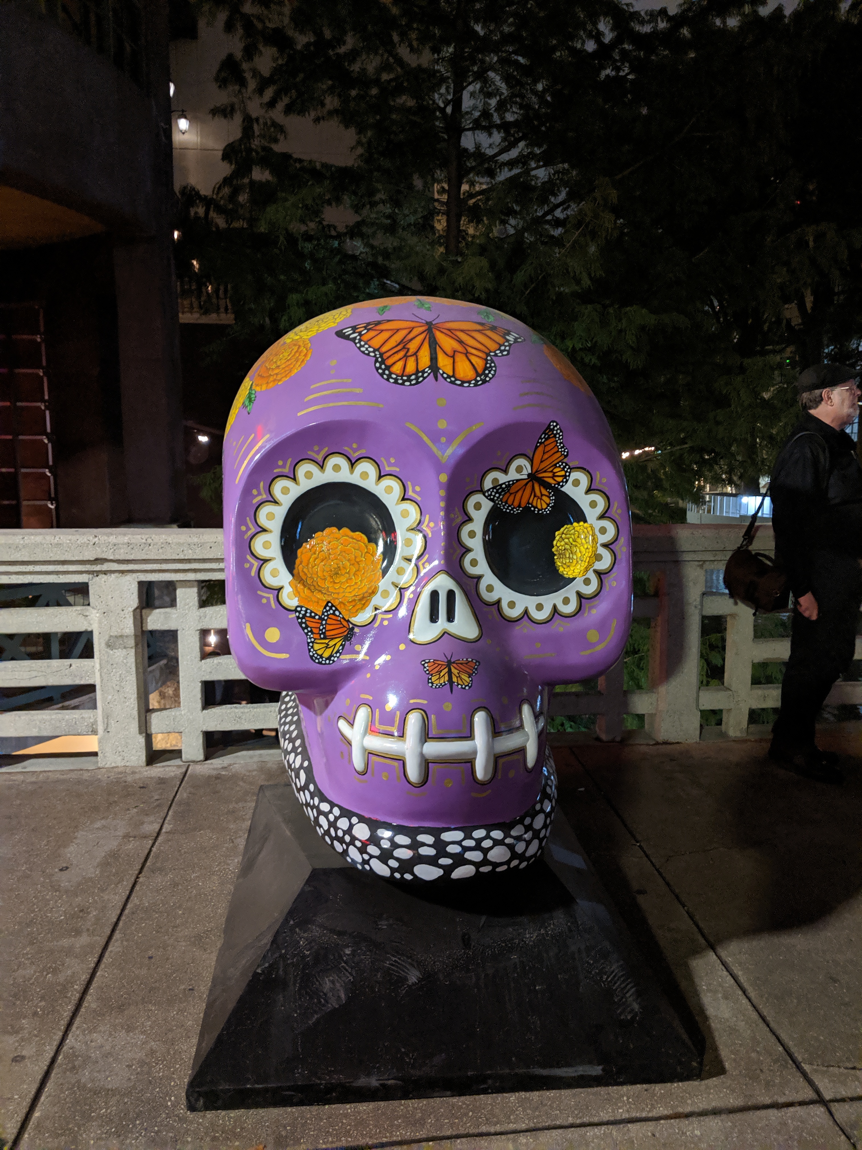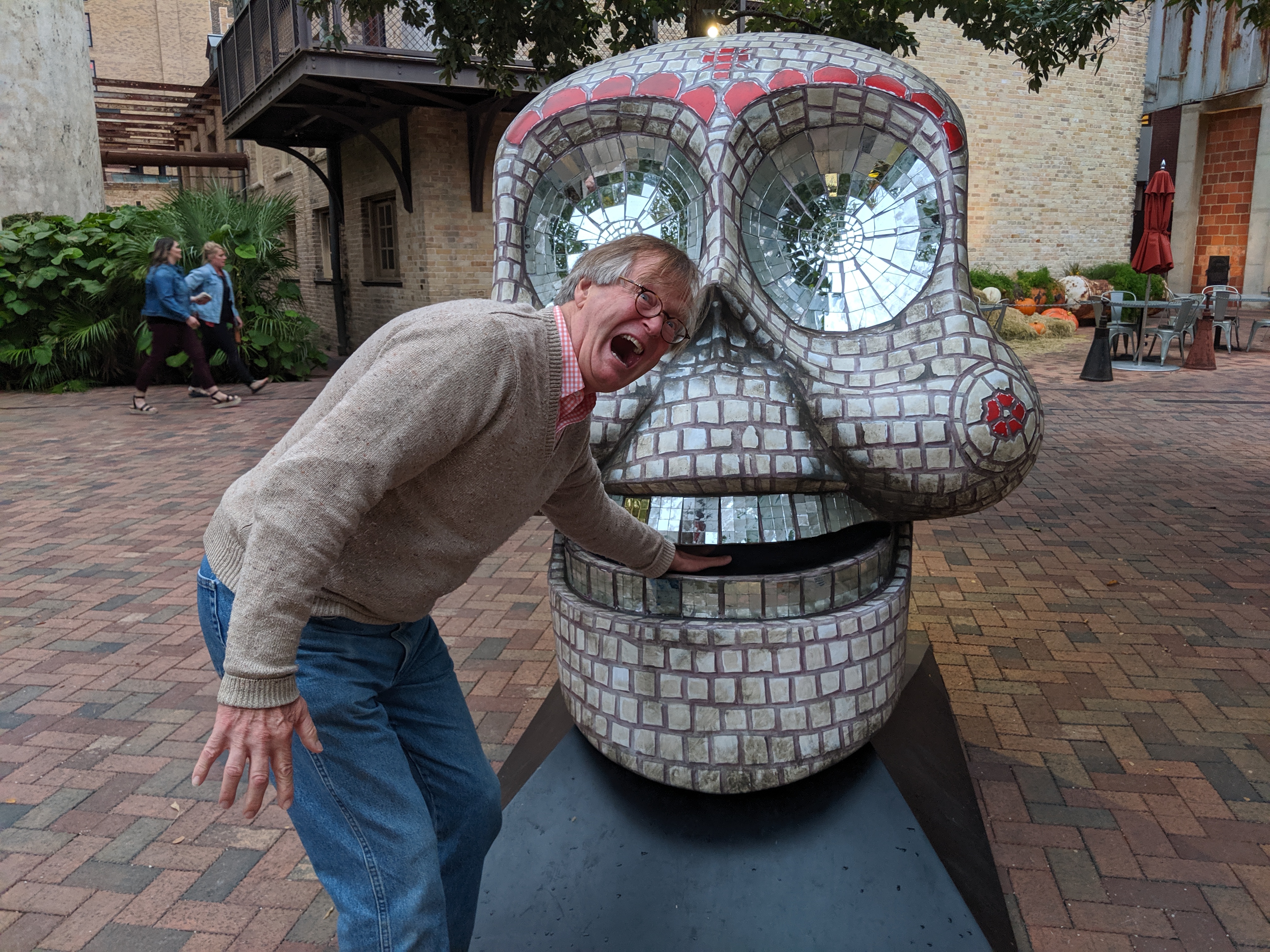 We are in San Antonio for the start of the Mexican celebration of “Dia de Muertos” the “Day of the Dead”. This is a big deal here. It is celebrated from October 31 to November 2. I had a discussion with a gal near where we went for dinner. She explained the celebration. It is to celebrate the life of those that have passed, something that I could understand and truly appreciate. However, the motif of the celebration is decorated skeletons. That is kind of creepy. The date coincides with Halloween, which has evolved to be a big celebration. My puzzlement over this phenomenon is not to be explored here. It also coincides with the celebration of All Saints Day and All Souls Day in the Catholic and Anglican religions. I am reminded of this by a fellow blogger.