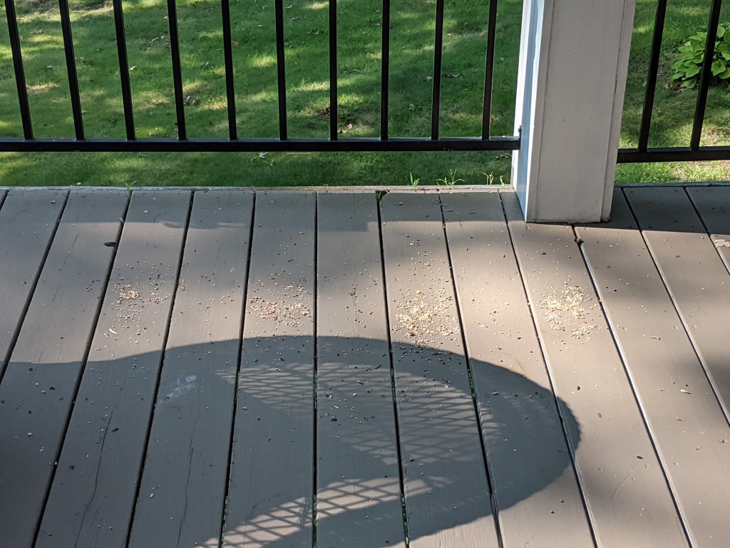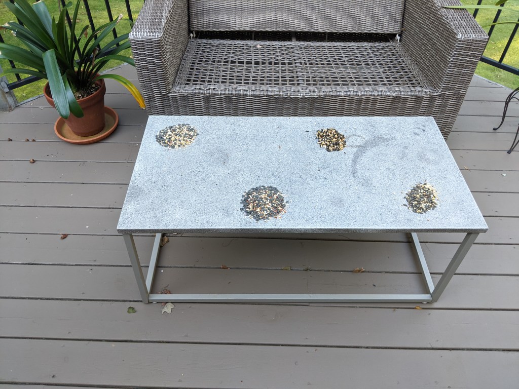Six hours later and neither bird nor squirrel has visited the seed. I will change the location to a place that birds and squirrels congregate.