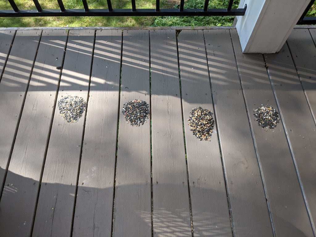 I noticed that the treated birdseed did not attracted many birds. True, it kept the squirrels away but there were few birds. Usually I note a lot of birds and that the feeder empties in a relatively short time. So, it is time for an experiment. I have put out four piles of seed: