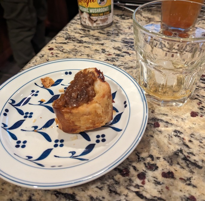 What to do? Well, I found a recipe that I thought all would like, or at least tolerate. I mixed a Haggis link with ground pork, I made an onion marmalade and bought a sheet of puff pastry. From these I made a “Haggis Sausage Roll”. It turned out much better than I anticipated. (James is a vegetarian so he had to make do with puff pastry and onion marmalade)