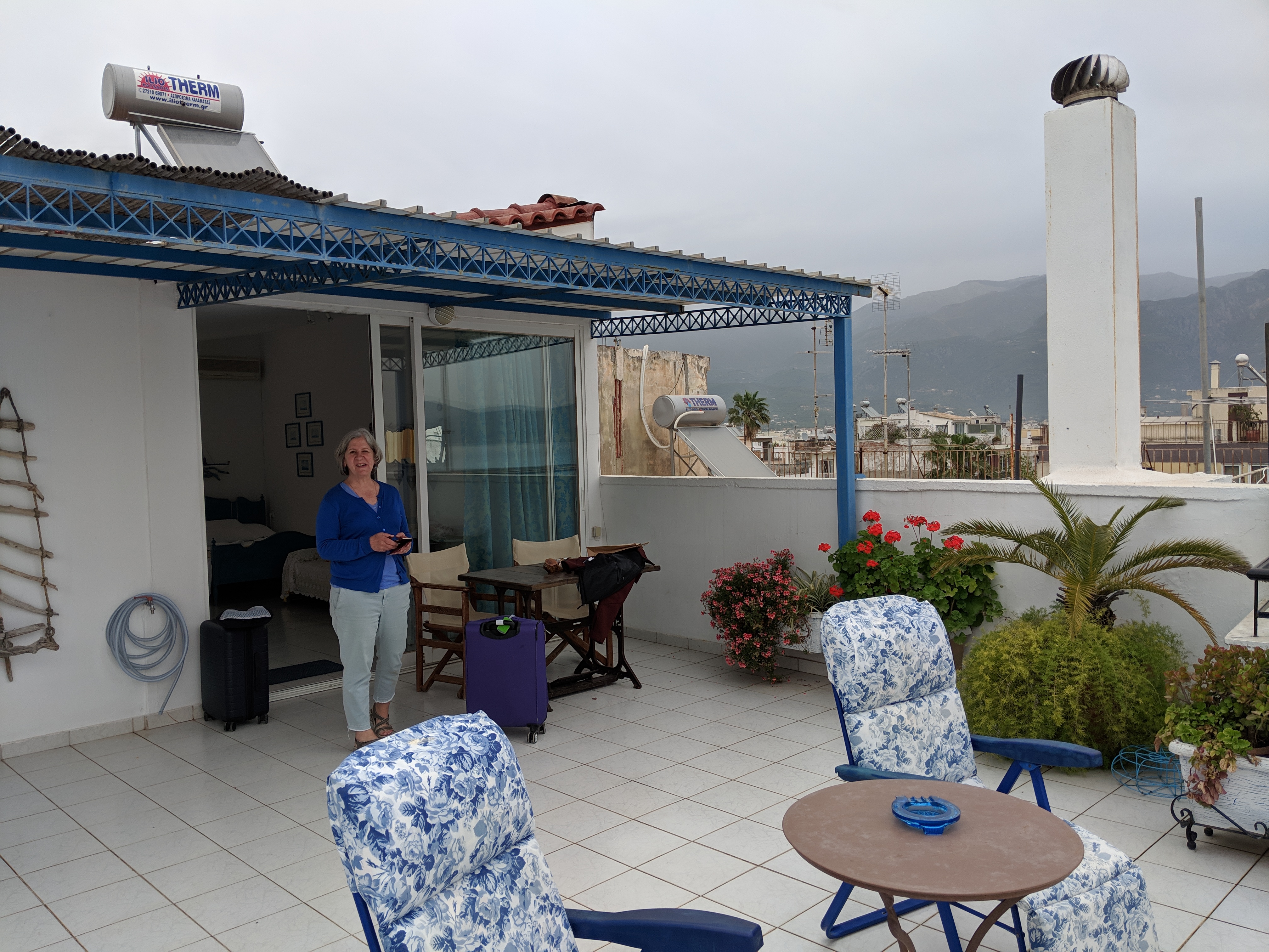 Went to Ioannis’ village for midnight Easter service. Big dinner followed. Again, delicious. Great family gathering.The Easter service was beautiful. The small chapel was filled to overflowing. Although I did not understand the words spoken or the significance of the rites, the experience was, none the less, very meaningful. We all lit candles and went back to Ioannis’ mother’s house. I am proud to say that my candle only went out once. The flame is passed from person to person. The original flame is brought from Jerusalem every year in a special container. This same flame that started in Jerusalem was eventually passed to me. When we arrived we had another meal (feast). This time we had: tomato and cucumber salad, saganaki, two types of mageiritsa (a stew like dish with organ meat and spinach), chicken with mushrooms, a soft Greek goat cheese, bread, homemade wine and a wonderful tzatziki. This was topped off with a sweet cheese filled pastry. Got back to our apartment about 2:30 am. I cannot find the words to express the hospitality and welcoming I experienced. Especially considering the fact that few spoke any English. The young ones (high school to college age who did know English best) kept us engaged in conversation all evening.We will be picked up before noon the Sunday to be taken to the big Easter feast the centerpiece of which will be goat roasted in an outside wood fired oven. I am very well aware that this is a very special opportunity to experience Greece in a way that few non-Greeks are blessed to experience, a very special experience with wonderful people.