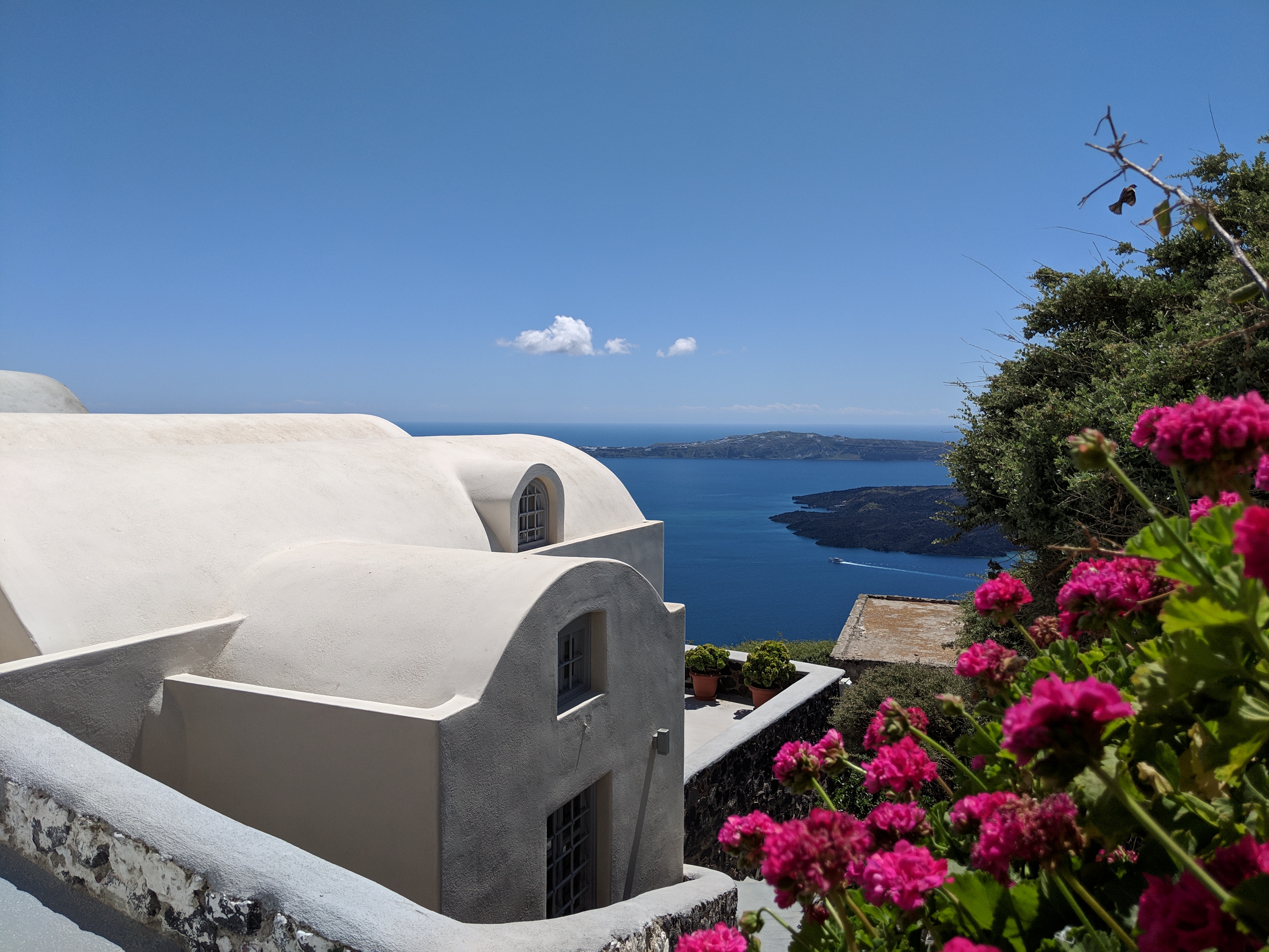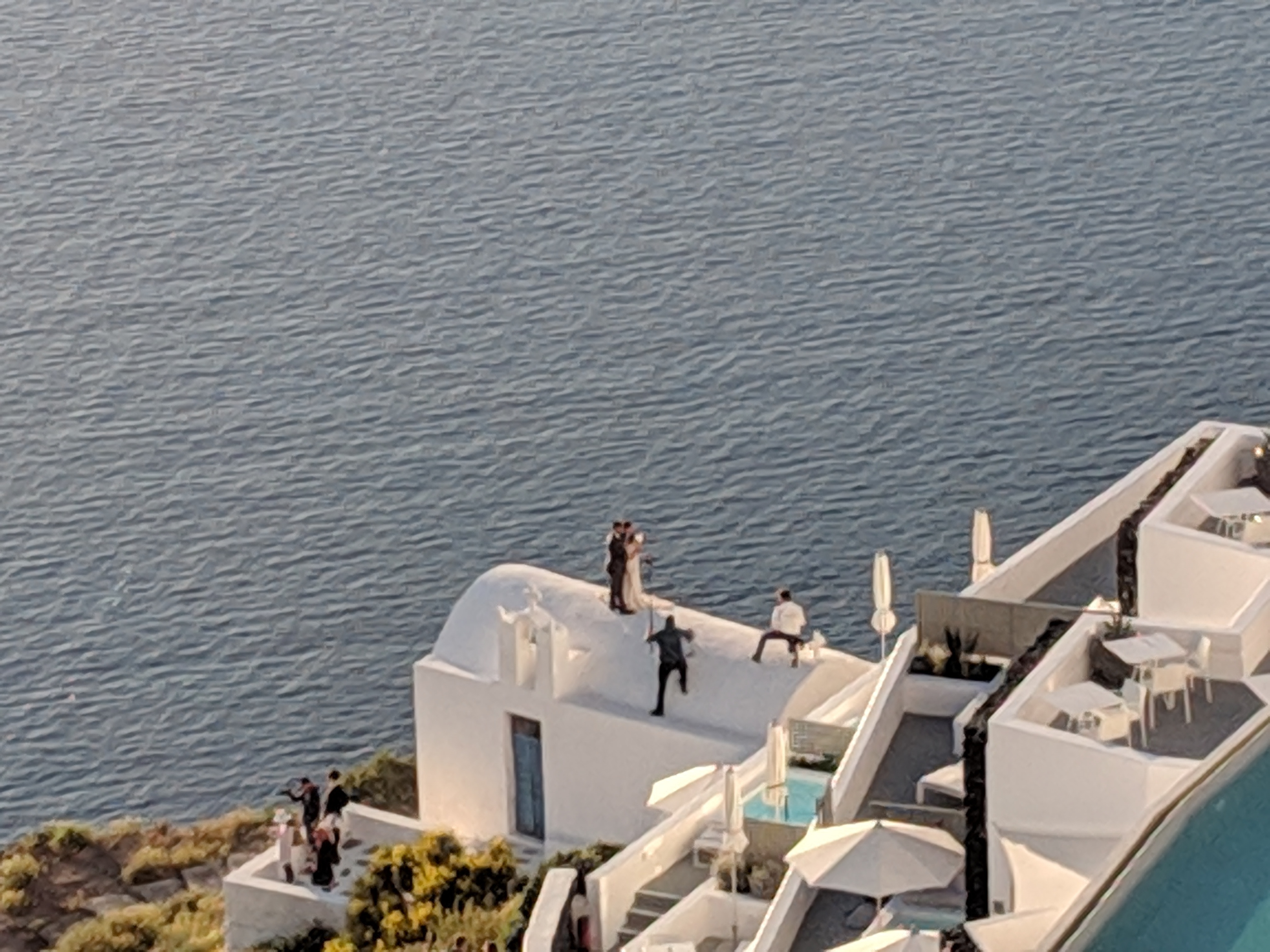 This is a totally vegetarian meal, no meat. Delicious, started with Greek coffee and koularakia and tiganithis, melamoukadina and tiganithis. Then we had the main meal: artichoke, stuffed pumpkin flowers, okra, spinach with tomato, rice, eggplant, olives bread and homemade wine. Finished with pastries and chocolate cake. We actually finished with a long nap back at our apartment. All the food was delicious the company wonderful and the day delightful in every way. I noticed that there were swallows nesting in the eaves of the house. The chicks had hatched but had not yet fledged.